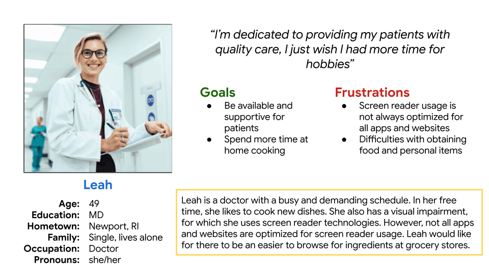 I assumed reduced time in-store would be the top priority. However, after researching my users, I realized that a subset of them also values discovering more items, which is reflected in my user persona, Leah. Designing solely on my assumptions would have ignored the needs of a substantial portion of my user base.