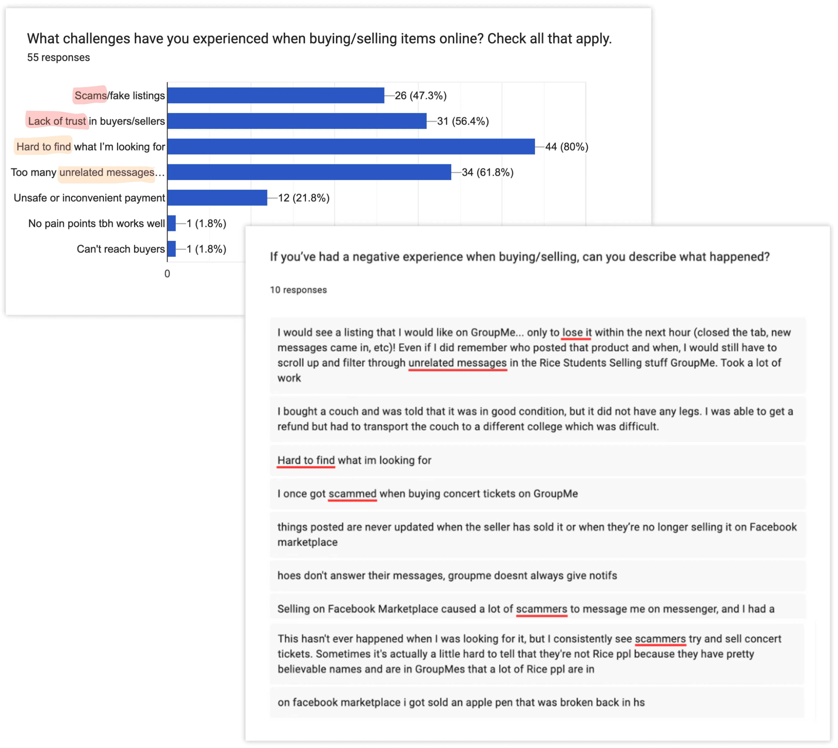 Specifically, there are 2 major types of pain points: organization (difficulty finding listings due to volume of messages) and reliability (lack of trust due to scams).