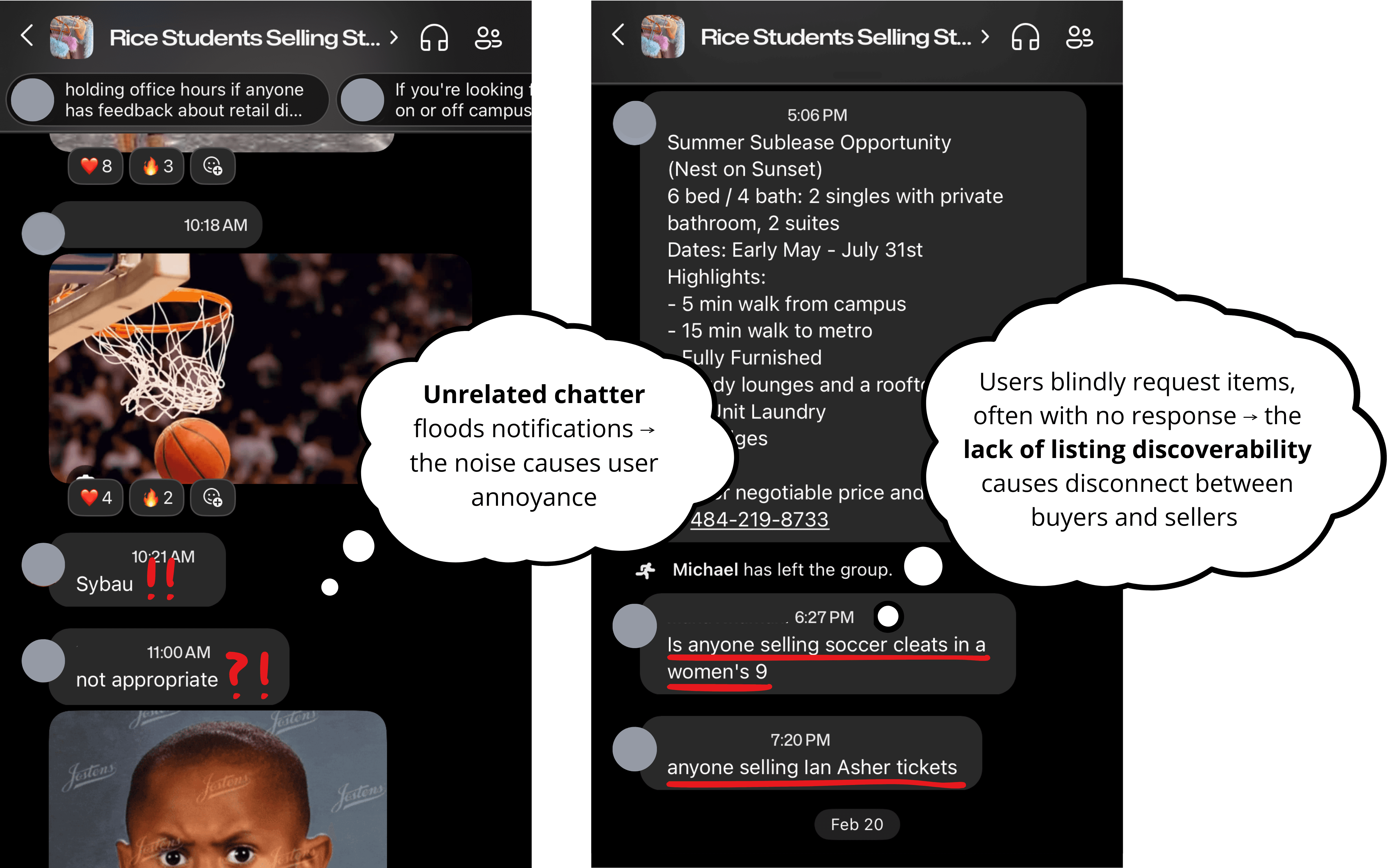 Students rely on an informal GroupMe channel called "Rice Students Selling Stuff" to buy and sell items on campus, but the platform's lack of structure means listings are buried within minutes. Additionally, the channel's open nature makes it easy for non-students to infiltrate and post scam listings.